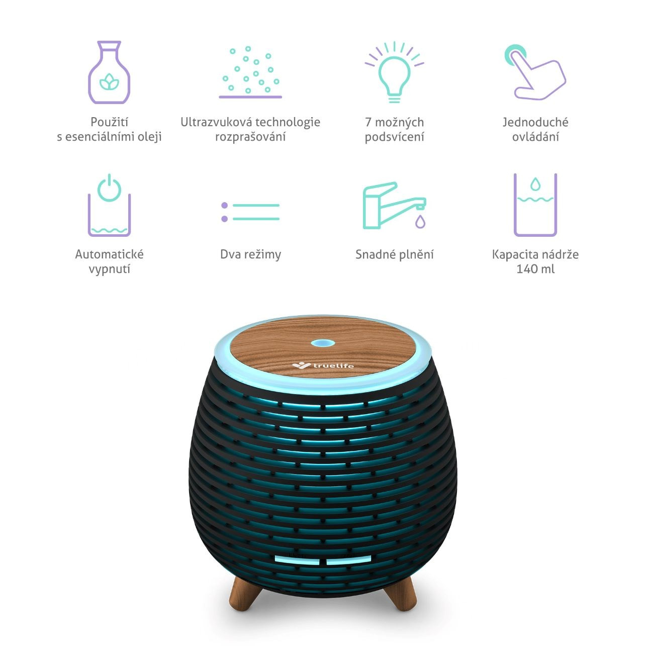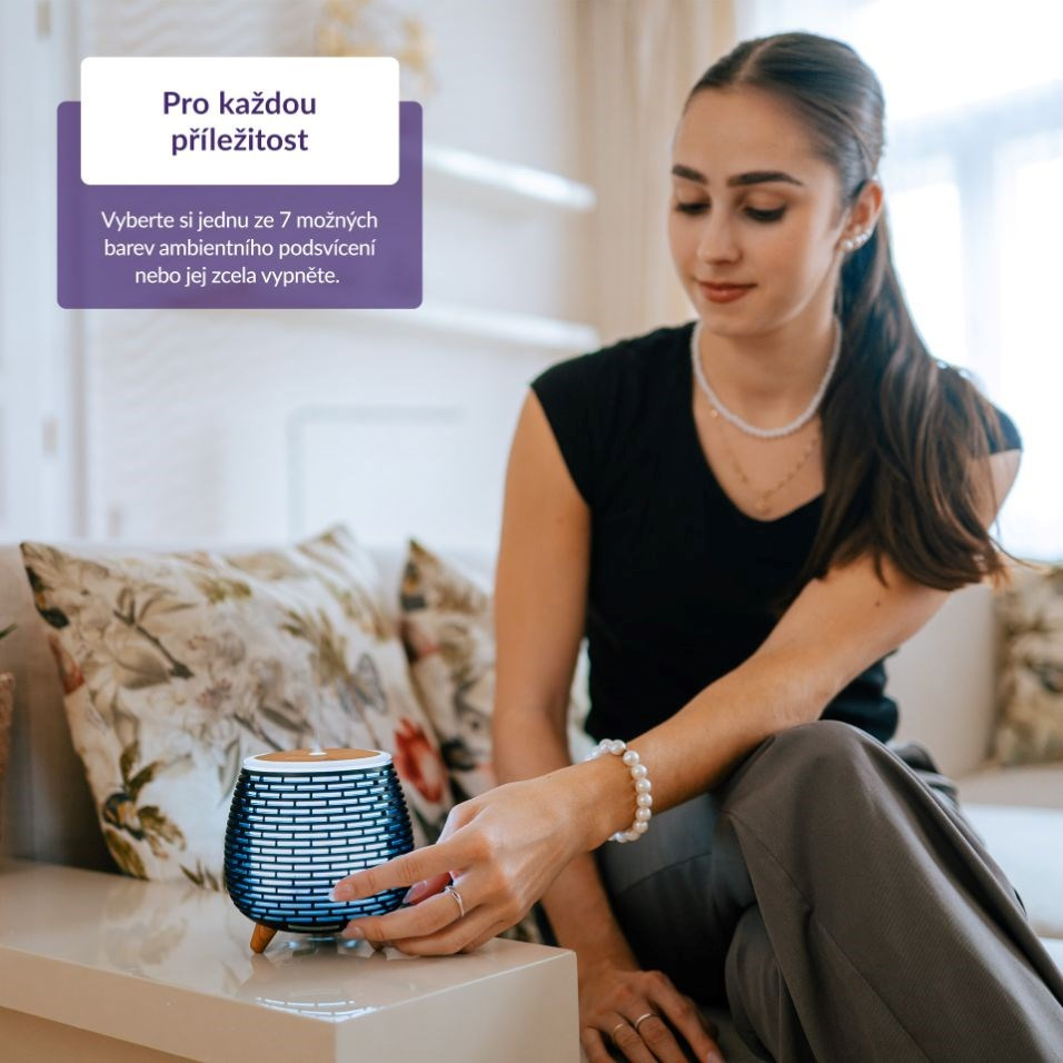 Stačí chvíľka a difuzér TrueLife premení vzduch v miestnosti, zvlhčí ho a prípadne naplní príjemnou vôňou esenciálneho oleja pomocou technológie OilFlow®. Zároveň však vie vytvoriť jedinečnú atmosféru vďaka podsvieteniu, kde si máte možnosť zvoliť až zo 7 farebných variantov.