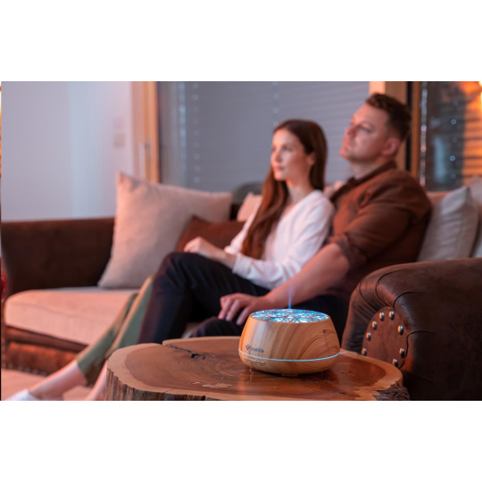 Difuzér funguje nielen ako reproduktor, ale rovnako ako zvlhčovač vzduchu, takže pokiaľ práve nie ste v nálade na aromaterapiu, stačí naplniť len nádobku na vodu. Pomocou jedného tlačidla zahájite proces zvlhčovania, difuzér začne vypúšťať do vzduchu v miestnosti jemnú paru, ktorá vzduch okamžite začne zvlhčovať na optimálnu hodnotu. Správna vlhkosť vzduchu pôsobí priaznivo na dýchacie cesty a môže pomôcť pri riešení problémov so suchou pokožkou, ekzémami alebo astmou. Požadované množstvo pary si jednoducho nastavíte pomocou príslušného tlačidla.
