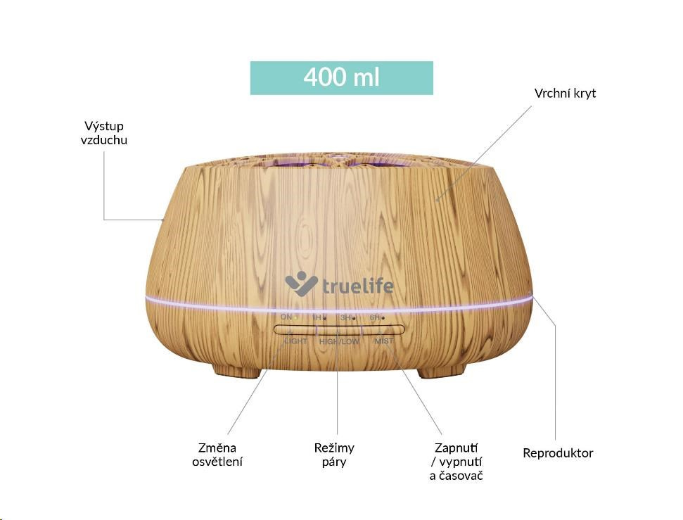 Difuzér Truelife so zabudovaným reproduktorom prevoní vzduch v miestnosti vašou obľúbenou vôňou behom niekoľkých málo okamihov. Vďaka Bluetooth konektivite slúži aj ako prenosný reproduktor a vašej aromaterapeutickej chvíľke tak nebude chýbať ani hudba podľa vašich predstáv. Užite si príjemnú meditáciu alebo relaxáciu v pohodlí domova. Do nádržky s vodou pridáte pár kvapiek esenciálneho oleja a OilFlow® technológia sa postará o zbytok. Difuzér eliminuje okolité pachy a pomocou štyroch vývodov príjemne prevoní vzduch v miestnosti. Využijete ho ale aj ako zvlhčovač vzduchu. Funguje na princípe ultrazvuku, vodu v nádrži mení na jemnú paru, ktorá sa miesi so vzduchom v miestnosti a takmer okamžite ho zvlhčuje na optimálnu hodnotu.