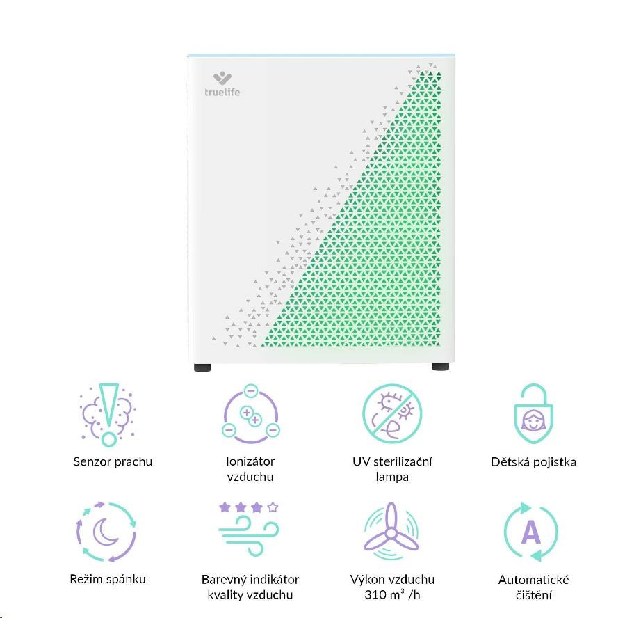 Čistička vzduchu TrueLife vyčistí až 310 m3 vzduchu za hodinu. Je vhodná do miestnosti o veľkosti 35-40 m2, môžete ju bez obáv prenášať. Čistička celkovo zlepšuje kvalitu vzduchu, ničí víry, baktérie a ďalšie nečistoty a môže tak významne pomôcť alergikom alebo astmatikom. Čistička je vybavená farebnými indikátormi kvality vzduchu, funkciou automatickej detekcie nečistôt a automatickým čistením. Ak bývate na mieste, kde sa často práši, poteší vás prítomnosť prachového senzora. 7-násobná filtračná sústava v podobe predfiltra, anti-bakteriálneho filtra, HEPA filtra, uhlíkového filtra, katalytického filtra, UV svetla a ionizácie zachytí až 99,9 % peľu a prachu a vyčistí 93,5 % výparných organických látok. Zároveň zachytáva aj víry a koronavírusy.