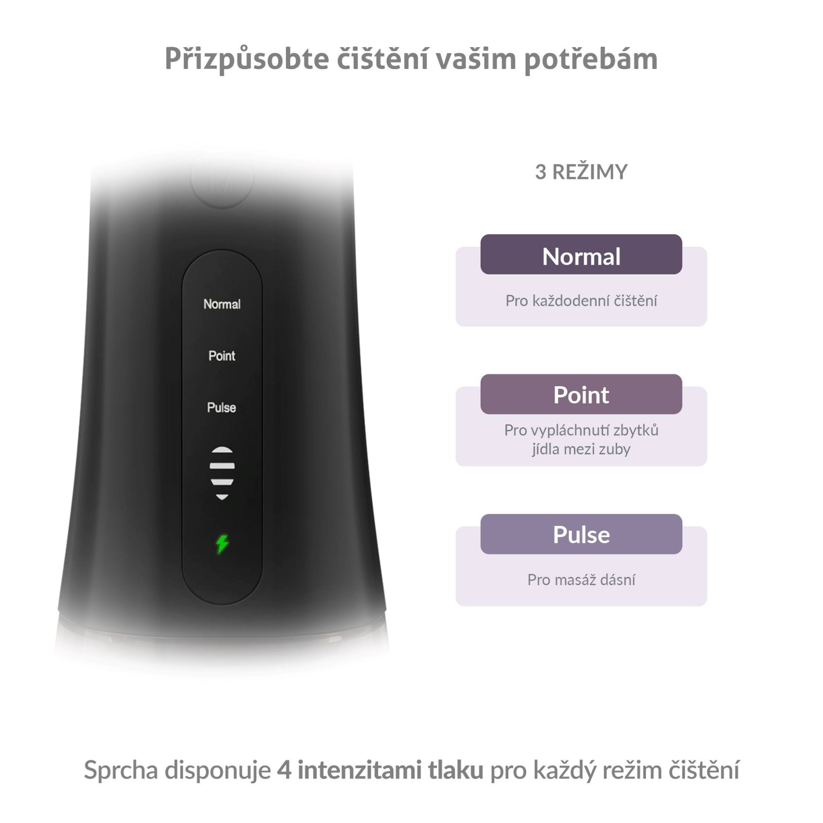 Sprcha ponúka 3 režimy čistenia s rôznymi intenzitami tlaku (30 – 130 PSI), vrátane režimu POINT, ktorý cielene a účinne odstráni zvyšky jedla z medzizubných priestorov.