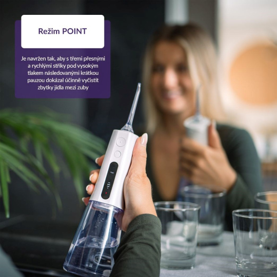 Sprcha ponúka 3 režimy čistenia s rôznymi intenzitami tlaku (30 – 130 PSI), vrátane režimu POINT, ktorý cielene a účinne odstráni zvyšky jedla z medzizubných priestorov.