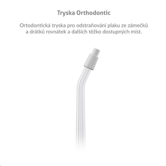 Ortodontická tryska na odstraňovanie plaku zo zámkov a drôtikov rovnátek a ďalších ťažko dostupných miest.