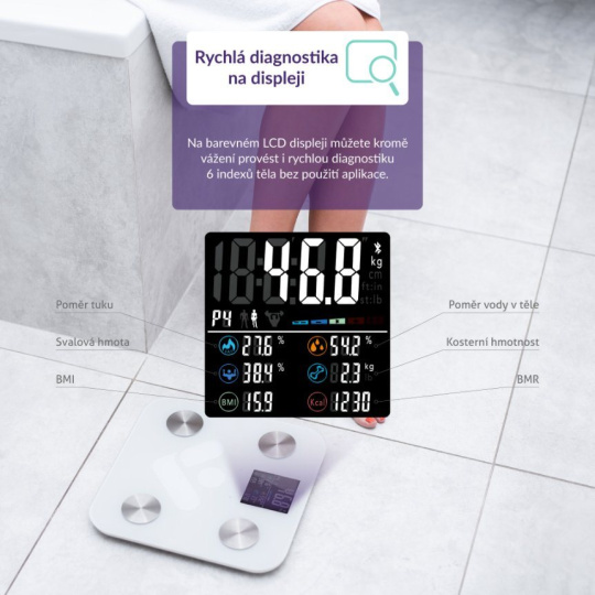 Predstavte si osobnú váhu tak šikovnú, že vám umožní dokonale poznať vlastné telo. TrueLife FitScale W6 BT to dokáže. Veľmi presne ukáže vašu aktuálnu hmotnosť a pridá kopu ďalších užitočných informácií vďaka bioelektrickej impedančnej analýze. Všetko prehľadne vidíte na farebnom LCD displeji so 7 indexmi tela. Váha je tak inteligentná, že automaticky rozozná používateľa. Prémiové krycie sklo unesie hmotnosť až 180 kg. Váha postačí pre rýchlu diagnostiku tela, ale pokiaľ vás zaujíma popis všetkých meraných indexov, skvelá je tiež mobilná aplikácia. Stačí prepojiť váhu cez Bluetooth s telefónom a v aplikácii hneď vidíte kompletný telesný reporting a štatistiky.