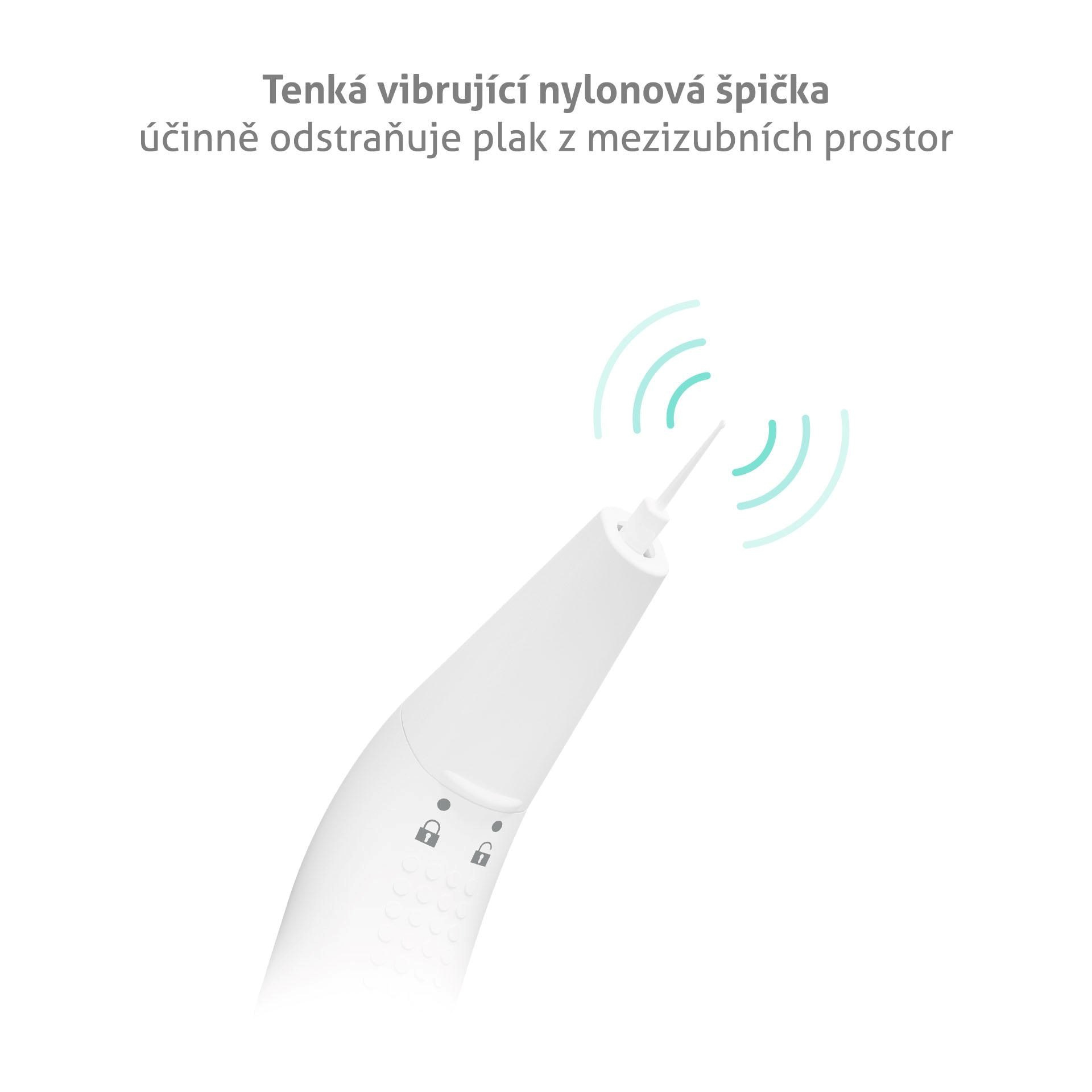 Tenká vibrujúca nylonová špička má na konci guličku, ktorá napomáha vytiahnuť šetrne zvyšky jedla z medzizubných priestorov.
