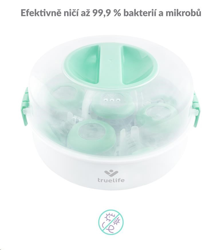 Ochrana imunitného systému vášho dieťaťa pre vás nemusí znamenať neustále vyvarenanie fľaštičiek a cumlíkov. So sterilizátorom do mikrovlnnej rúry TrueLife Invio MS5 sterilizujete detské fľaštičky, hryzátka a ďalšie predmety behom dvoch minút. Na to potrebujete len obyčajnú vodu a mikrovlnnú rúru. Sterilizátor využíva nemocničnú metódu parnej sterilizácie, ktorá je rýchla, účinná a bez chemických látok. Ničí tak 99,9 % baktérií a mikróbov, ktoré sa nachádzajú na detských predmetoch, bez poškodenia ich povrchu. Sterilizátor je navrhnutý pre väčšinu mikrovlnných rúier na trhu a zvládne väčšinu typov dojčenských fliaš. Pojme až 5 fľaštičiek naraz a ľahko sa ovláda. Vďaka kompaktnej veľkosti s ním môžete bez problémov cestovať.