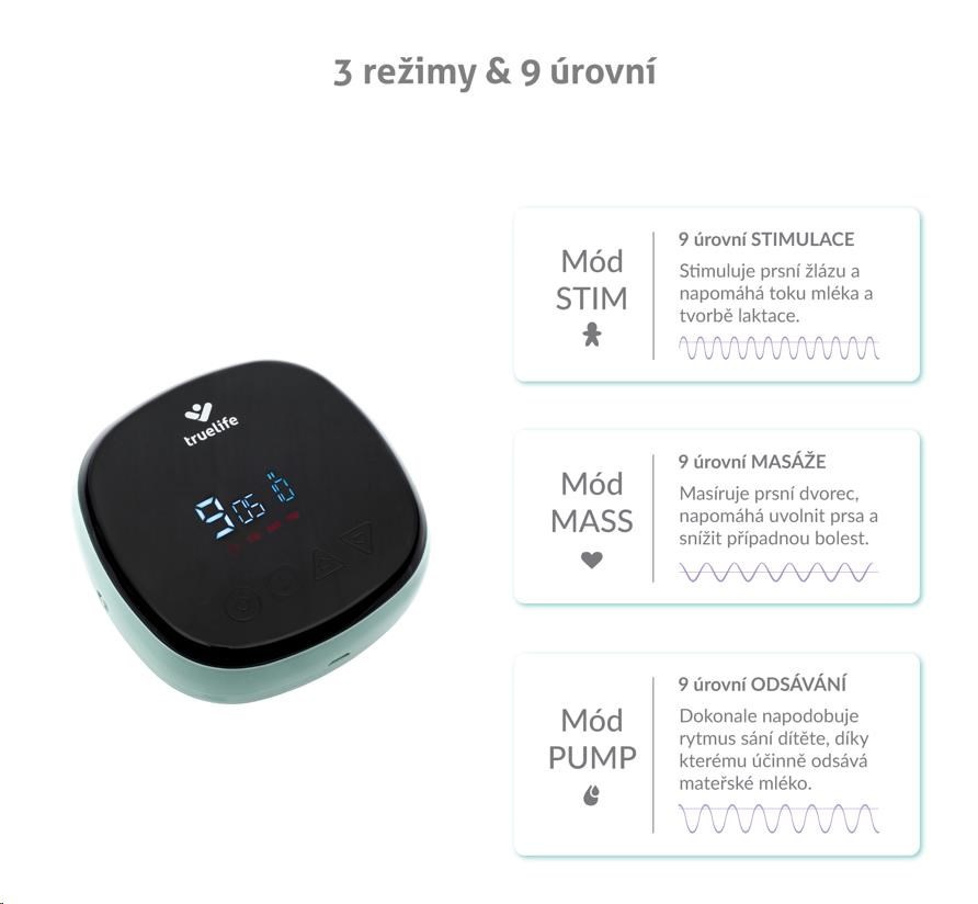 Okrem odsávania si môžete zvoliť ešte mód stimulácie alebo masáže. Pri každom móde máte na výber z deväť úrovní, takže si odsávačku nastavíte presne tak, ako vám to vyhovuje.