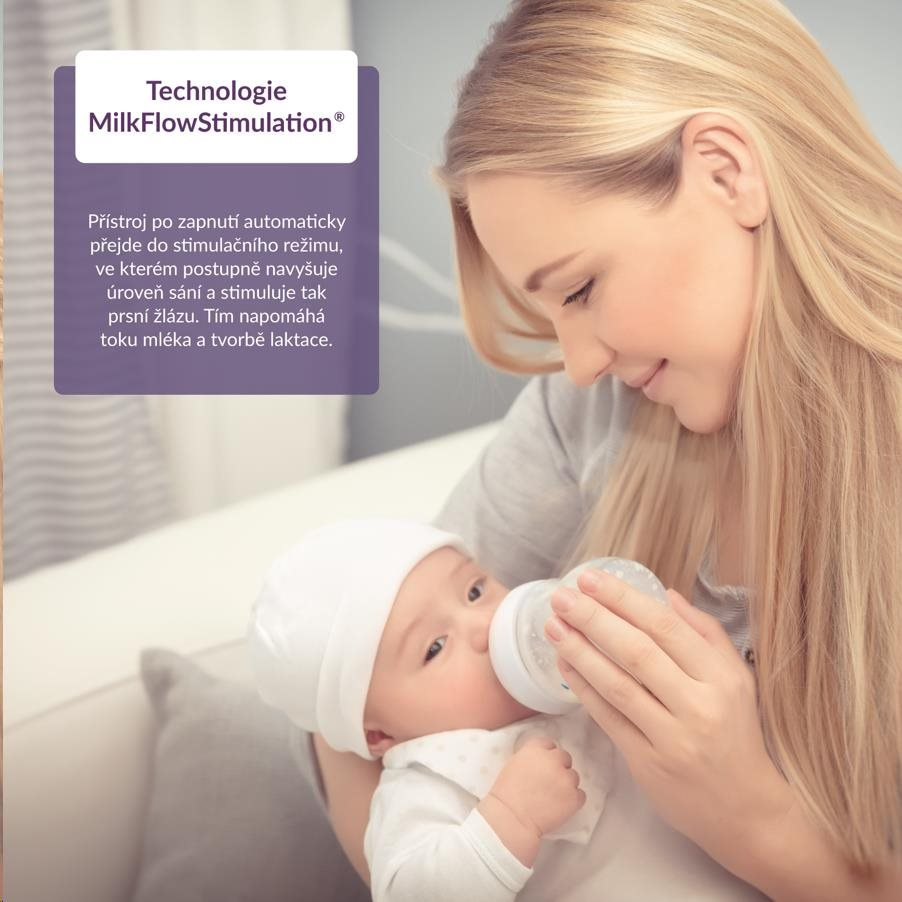 Vlastnosti a funkcie Bez BPA, 2fázové odsávanie, možnosť nastavenia intenzity odsávania - 9 úrovní, 3 režimy – odsávanie, stimulácia, masáž, technológia MilkFlowStimulation®, časovač pre automatické vypnutie, zásobník na mlieko 150 ml, výdrž 100 minút, elektrický pohon, zabránenie spätnému toku, LED displej s dotykovými tlačidlami, tichý chod, ergonomický dizajn, nízka hmotnosť