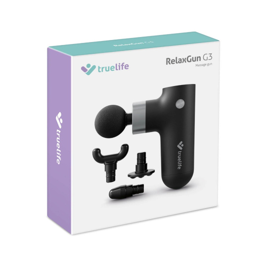 Či už športujete a potrebujete uvoľniť svoje vyťažené svaly, alebo máte sedavé zamestnanie a chcete pomôcť zmierniť napätie a bolesť, masážna pištoľ TrueLife RelaxGun G3 je pre vás to pravé. Z pohodlia domova vás vymasíruje, pomôže zregenerovať svaly, zlepší prietok krvi a uvoľní kŕče. Jednoducho si vyberte jednu zo 4 vymeniteľných hlavíc a zvoľte jednu zo 4 intenzít masáže. Malé, ľahké telo, ktoré dobre padne do ruky, má prítlak 8 kg a frekvenciu pohybu až 2850 pohybov za minútu. Amplitúda je 6 mm. Bezpečné používanie zabezpečuje funkcia Safety stop, ktorá spomalí alebo vypne stroj, ak je vyvíjaný príliš veľký tlak. Po 15 minútach používania sa automaticky vypne. Nabíjateľná lítiová batéria zvládne až 3 hodiny prevádzky.