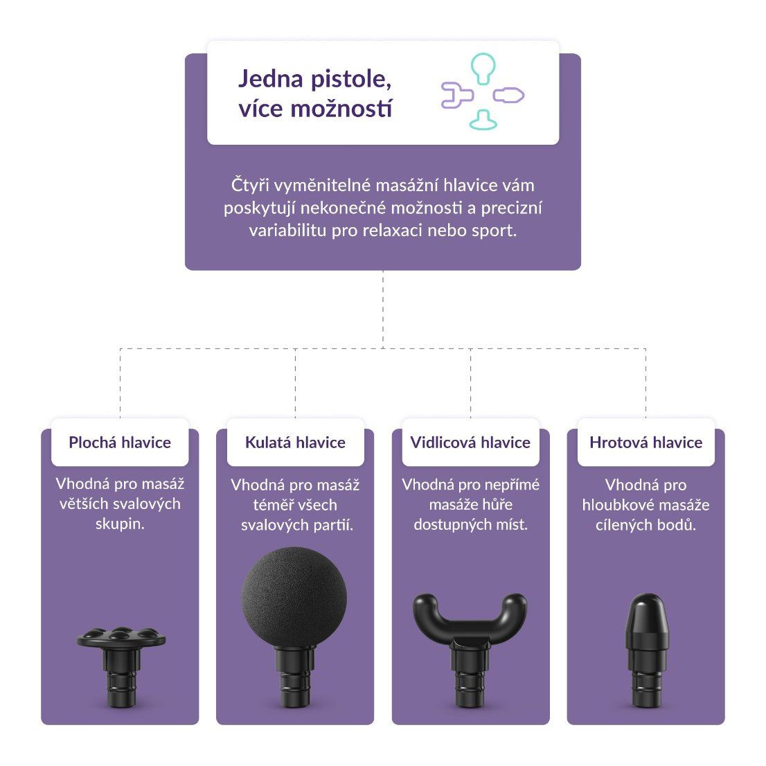Masážna pištoľ je vybavená štyrmi masážnymi hlavicami na rôzne typy masáží.