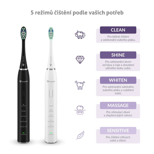Sonické kefky TrueLife SonicBrush Clean30 obsiahnuté v sade disponujú 5 režimami čistenia, ktoré uľahčujú každodennú starostlivosť o zuby a ďasná. Bežné čistenie obstará režim Clean, s odolnejším zubným povlakom zatočí režim Whiten, ktorý zároveň prispieva k bieleniu zubov. Dokonale žiarivý úsmev zaistí režim Shine efektívne odstraňujúci pigmentové škvrny spôsobené napríklad kávou či čajom. Ak patríte k ľuďom s citlivejšími zubami a ďasnami, potom oceníte režim Sensitive. K zdravším ďasnám prispeje režim Massage, a to ich stimuláciou. Ideálna doba čistenia sú 2 minúty, strážiť ich ale nemusíte, časovač to obstará za vás. Tiež vždy po 30 sekundách upozorní, že je čas presunúť sa na ďalšiu časť chrupu.
