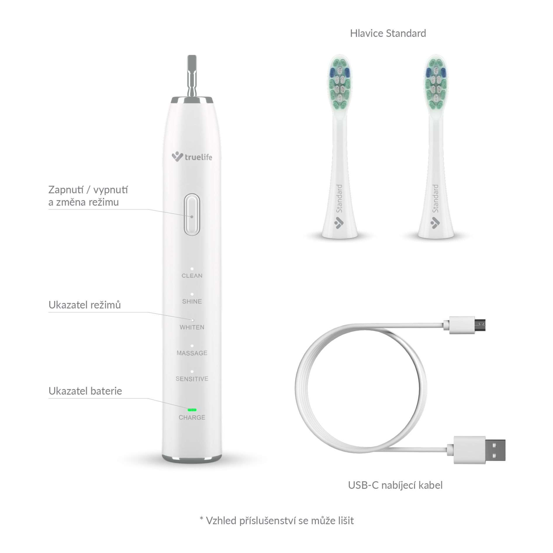 Krásny úsmev začína správnou každodennou starostlivosťou o zuby. Skvelým cenovo dostupným a výkonným pomocníkom je sonická kefka TrueLife SonicBrush Clean30 so sonickou technológiou SonicTrue®. Jej 70 000 pohybov za minútu zuby dokonale vyčistí a ide ešte ďalej vďaka možnosti výberu z 5 režimov čistenia. Clean vyčistí zuby a odstráni zubný povlak, Shine zbaví zuby škvŕn od čaju a kávy, na vybielenie slúži režim Whiten, ďasnám urobí dobre Massage a pre citlivé zuby a ďasná je určený režim Sensitive. Balenie obsahuje 2 hlavice Standard, ktorých modré štetinky zhruba po troch mesiacoch zbelejú. Tým indikujú, že je potrebné hlavicu vymeniť. Na jedno nabitie vydrží kefka 30 dní, potom ju iba stačí dobiť pomocou priloženého USB-C kábla.