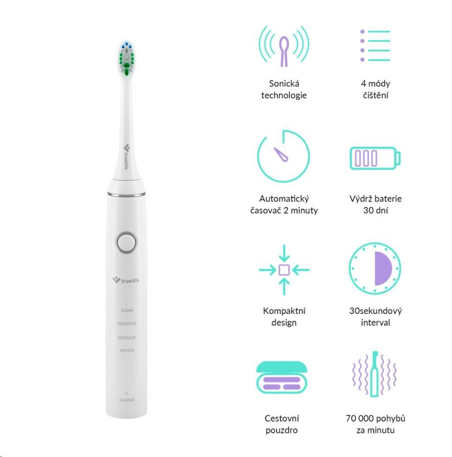 Zdravé zuby a ďasná? Spoľahnite sa aj vy na kefku s modernou sonickou technológiou TrueLife SonichBrush Compact. Vďaka jej starostlivosti získate žiarivý úsmev a nedáte šancu škodlivým baktériám. Hlava kefky kmitá vysokou frekvenciou a každým pohybom odstráni maximum zubného plaku. Môžete vyberať zo 4 režimov čistenia. Batéria vydrží celých 30 dní. Balenie obsahuje sonickú kefku, nabíjaciu stanicu, dve hlavice Standard a cestovné puzdro (od roku 2021).