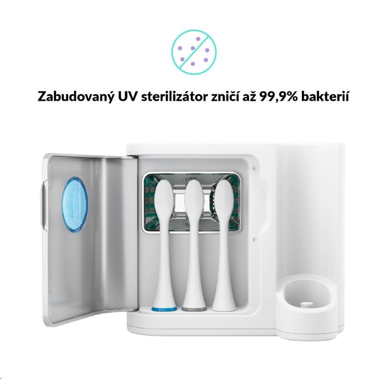 UV svetlo behom chvíle dezinfikuje hlavu kefky a zničí až 99,9 % baktérií – čistá ústa začínajú čistým kefkou.