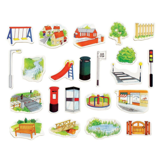 Balíček okolia pre Bee-Bot & Blue-Bot robota. Vybuduj si vlastné mesto pre Bee-Bota alebo Blue-Bota. Balíček obsahuje podložku, pouličné lampy, stromy, budovy a 22 drevených kusov pouličného nábytku.