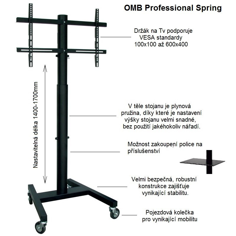 Tv stojan OMB Professional Spring Televízny stojan s plynovou pružinou pre jednoduché a rýchle nastavenie výšky 140-170cm bez náradia, nosnosť 40kg, VESA 100x100 až 600x400, na televízory a monitory 32" až 65" Profesionálny stojan robustný, veľmi pevný, bezpečný a stabilný konštrukcia, ktorý má vo vnútri nosníka integrovanú plynovú pružinu pre možnosť veľmi jednoduchého nastavenia výšky obrazovky bez nutnosti použitia akéhokoľvek náradia, navyše neuveriteľne rýchlo a pohodlne. Plynová pružina zabezpečí po stlačení bezpečnostnej páčky plynulé vysunutie obrazovky do hornej polohy, v prípade potreby znížiť výšku stačí zatlačiť na obrazovku. Regulovať výšku je možné v rozmedzí 140cm až 170cm (výška stojana po stred obrazovky). Stojan je ideálny na televízory a monitory s hmotnosťou do 40kg, ktoré podporujú akýkoľvek VESA štandard v rozmedzí 100x100 až 600x400mm vrátane. Odporúčaná veľkosť uhlopriečky je 32" až 65", ale je možné použiť aj väčšie obrazovky až do uhlopriečky 65". Podstavec stojana je osadený kvalitnými pojazdnými kolieskami, ktoré zabezpečujú vynikajúcu mobilitu. Televízny stojan OMB Professional Spring dodávame v čiernom prevedení. Televízny stojan s nastavením výšky a kolieskami OMB Professional Spring Technické údaje: max. záťaž 40kg podpora VESA štandardu 100x100 až 600x400 odporúčaná veľkosť uhlopriečky zavešeného obrazu 32" až 65" nastaviteľná výška stojanu v rozmedzí 1400 až 1700mm integrovaná plynová pružina pre jednoduché a rýchle nastavenie výšky bez použitia náradia možnosť dokúpenia police na príslušenstvo OMB Shelf Handy s rozmermi 447x300mm nosnosť police na príslušenstvo 5kg robustná, veľmi pevná konštrukcia profesionálna kvalita bezpečný, stabilný stojan farebné prevedenie čierne záruka 3 roky Televízny stojan s plynovou pružinou pre jednoduché a rýchle nastavenie výšky v rozmedzí 140 až 170cm, nosnosť 40kg, VESA štandard 100x100 až 600x400 - OMB Professional Spring Televízny stojan OMB Professional Spring podporuje VESA štandardy: VESA 100x100 VESA 200x100 VESA 200x200 VESA 300x200 VESA 300x300 VESA 400x200 VESA 400x300 VESA 400x400 VESA 600x400 Na Tv stojan je možné zavesiť všetky typy televízorov a monitorov, ktoré majú hmotnosť do 40kg a podporujú ktorýkoľvek z vyššie uvedených VESA štandardov. Veľkosť televízora nie je podstatná, iba odporúčame minimálnu uhlopriečku 32", ideálne 37" a väčšie. Na televízny stojan OMB Professional Spring je možné dokúpiť polici na príslušenstvo OMB Shelf Handy s nosnosťou 5kg: Police na príslušenstvo ku stojanu OMB Professional Spring - OMB Shelf Spring Vďaka výbornému riešeniu nastaviteľnej výšky pomocou plynové pružiny zvládne nastavovanie výšky bez akéhokoľvek náradia a námahy ktokoľvek. Stojan je ideálny na využitie pri prezentáciách, výstavách, prednáškach, konferenciách, čakárňach a kdekoľvek pre komerčné aj nekomerčné účely.