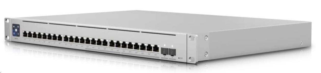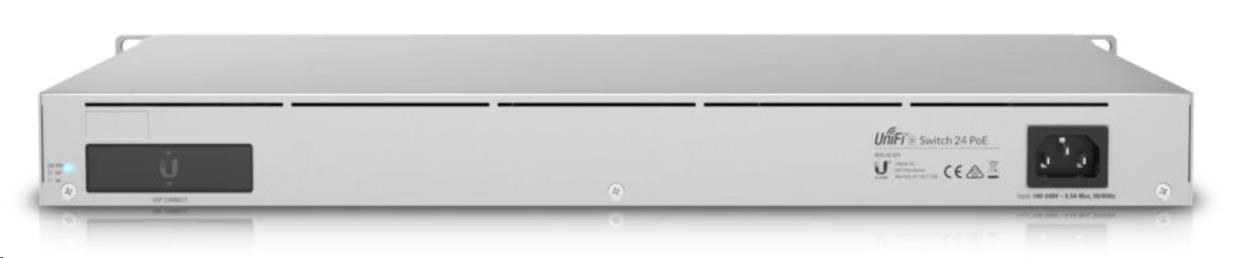 UniFi Switch Enterprise 24 PoE je spoľahlivý, spravovateľný 2.5-gigabitový prepínač L3 s prepínacou kapacitou 124 Gb/s, (12) 2.5-gigabitové porty LAN, ďalších (12) gigabitových portov LAN a dva porty SFP+ (10 Gb/s). Všetky ethernetové porty podporujú štandard 802.3af/at PoE-Out s výstupným výkonom 30 W/port a celkovým rozpočtom PoE 400 W. Okrem štandardných funkcií má prepínač aj 1,3" dotykový displej, ktorý poskytuje informácie o systéme, teplote, štatistikách portov, napájaní PoE a mnoho ďalších informácií. Prepínač je možné napájať štandardným 230V napájaním, ale aj prostredníctvom UniFi SmartPower RPS, ktoré slúži skôr na zálohovanie napájania v prípade výpadku interného zdroja.