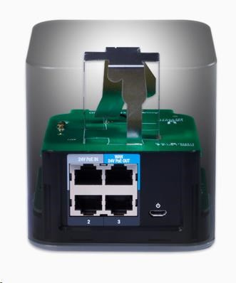 router má 3x 10/100Mbps LAN (prvý port LAN podporuje PoE IN), 1x 10/100Mbps LAN/WAN s podporou PoE Out, napájací konektor microUSB a rádiovú časť 2x2 MIMO WiFi s modulačnou rýchlosťou 300Mbps (2.4GHz).