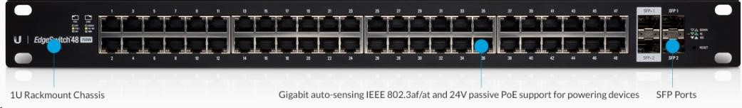 nový produktový rad EdgeMAX pozostáva z gigabitových manažérskych PoE+ prepínačov. Vyznačujú sa vysokým výkonom (priepustnosť 26/70 Gb/s bez blokovania) spolu s pokročilými funkciami L2/L3. K dispozícii je inteligentné PoE. V predvolenom nastavení je PoE aktívne podľa normy 802.3af/at, ak sa vyžaduje pasívne PoE (24 V), možno ho nakonfigurovať manuálne (ON/OFF 24V na port). K dispozícii sú aj sloty SFP na pripojenie k chrbticovej sieti. verzia s 24 portmi ponúka dva porty SFP 1 Gb/s a verzia so 48 portmi pridáva dva sloty SFP+ (10 Gb/s). Konfiguráciu možno štandardne vykonať prostredníctvom webového prehliadača, prostredie je veľmi užívateľsky prívetivé a intuitívne. Pre pokročilých používateľov je k dispozícii aj CLI (rozhranie príkazového riadku) cez telnet alebo zabezpečené SSH.