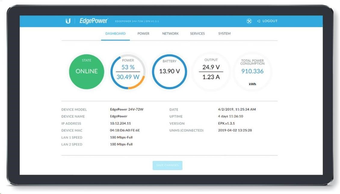 na pripojenie napájaných zariadení sú k dispozícii 2 ethernetové porty s pasívnym 54V PoE Out, rýchlosťou 100 Mb/s a 1 výstup na svorkovnicu. EdgePower možno spravovať prostredníctvom aplikácie UNMS alebo vlastného webového rozhrania. Samozrejme, k dispozícii je podpora protokolu SNMP.