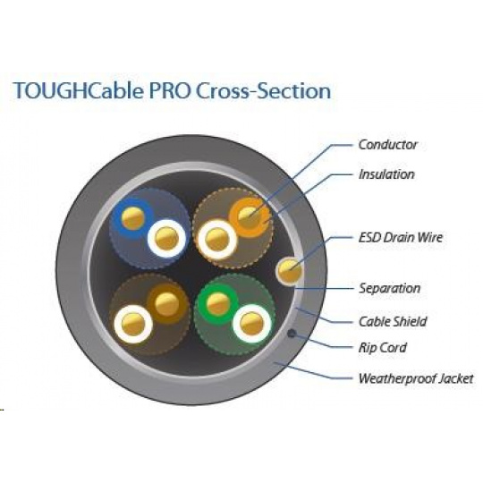 tOUGHCablePRO je špeciálne navrhnutý tienený kábel FTP Cat5e na extrémne nasadenie v najťažších poveternostných podmienkach, ktorý zásadne eliminuje riziko poškodenia aktívnych komponentov vo vonkajšom prostredí elektrostatickým výbojom.