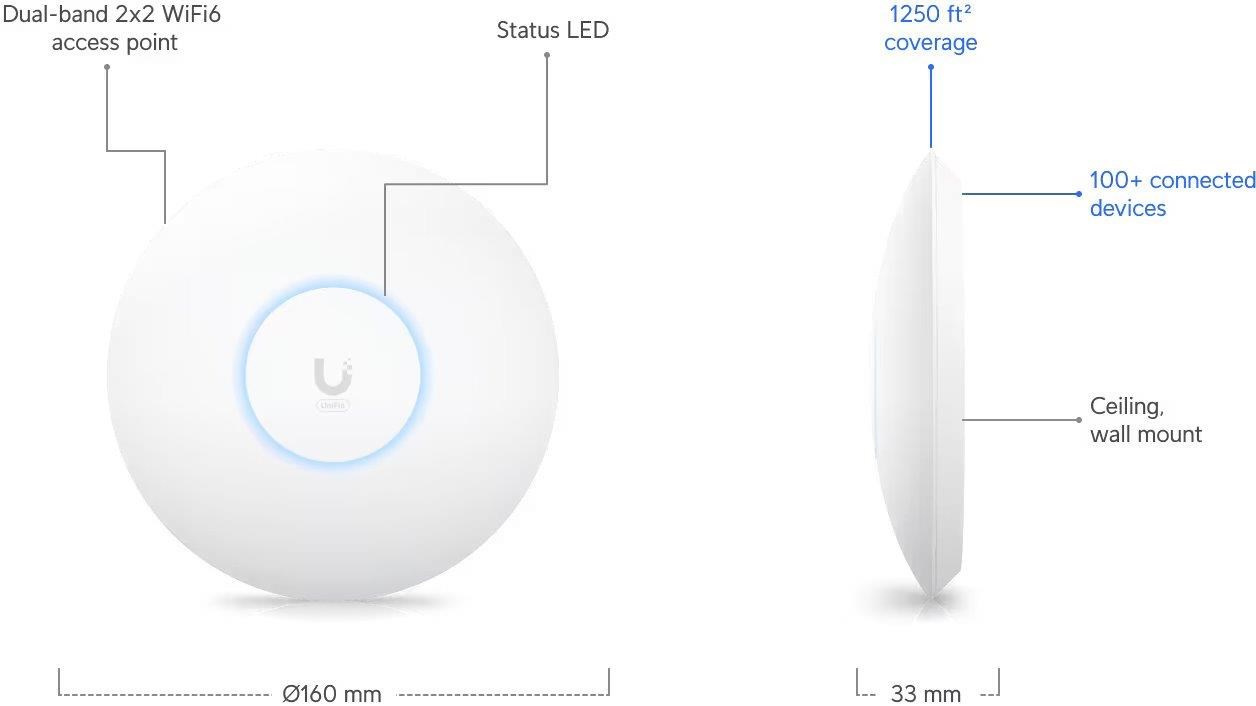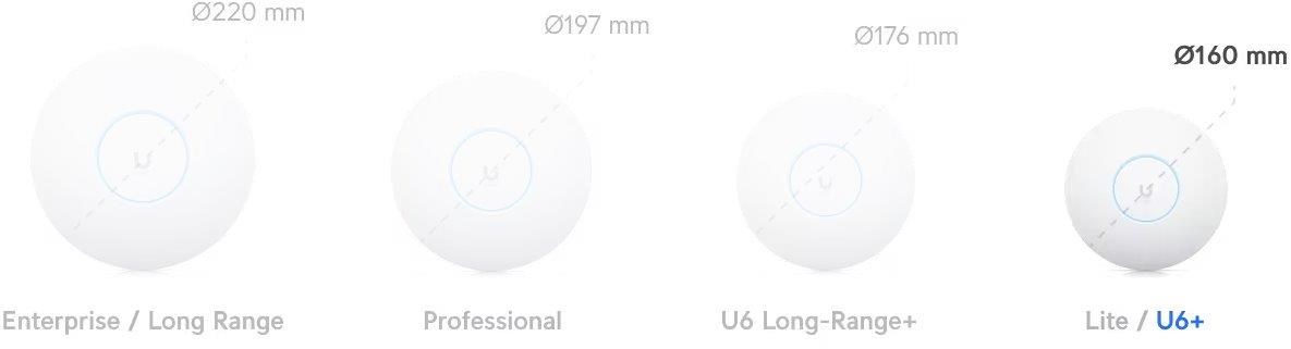 Popis produktu UniFi 6+ Access Point je základní Dual Band WiFi 6 AP (2.4GHz a 5GHz) do menších hal, skladů či kanceláří. U6+ je schopen dosáhnout skvělých propustností. V pásmu 5 GHz (2x2 MIMO) je to 2402 Mbps při použití 160 MHz šířkou pásma a ve 2.4 GHz (2x2 MIMO) je to 574 Mbps, což mu umožňuje podporovat více než 300 současně připojených klientů. Pro připojení do sítě má Access Point Gigabitový ethernet s podporou aktivního (802.3at) ale i pasivního (44 až 57V) PoE. Klíčové vlastnosti • Dual band WiFi 6, podpora 802.11a/b/g/n/ac/ax (WiFi 6) • 5 GHz propustnost až 2402 Mbps (2x2 MIMO) • 2.4 GHz propustnost až 574 Mbps (2x2 MIMO) • Anténní zisk - 2.4GHz (3 dBi) a 5GHz (5.4 dBi) • WPA/WPA2/WPA3 šifrování • Gigabitový LAN port • Napájení přes 802.3af nebo pasivní 44 až 57V PoE, spotřeba 9W • Podporováno UniFi Controllerem od verze 7.3.76 Centrální řízení jednotek Ke správě zařízení je potřeba stáhnout z oficiálních stránek originální software nazývaný UniFi Network Controller, díky kterému lze řídit celou síť. Nespornou výhodou UniFi Controlleru je, že je zcela zdarma bez jakéhokoliv omezení! Tento centrální management umožní nahrávat mapy a nastavit základní parametry i pokročilé funkce jako například SSID, guest účet, úvodní stránku, statistiky provozu i seznam a status asociovaných klientů vždy snadno a rychle. Výhody UniFi řešení • Fast Roaming - bezvýpadkový přechod mezi jednotlivými AP • Wireless uplink (hodí se tam, kam není možné dostat datový kabel) • Až 8 SSID • Detailní statistiky provozu • Guest síť • Load balance - udržování rovnoměné zátěže / přepínání klientů • Omezování rychlosti pro každé SSID Obsah balení • Zařízení • Kit na přichycení na strop/stěnu (plastový a kovový kulatý díl) • Sada šroubků a hmoždinek Technické parametry Bezdrátové vlastnosti Bezdrátové frekvence:2.4 + 5 GHz (dual band) WiFi standardy:802.11n, 802.11a, 802.11ac, 802.11b/g, 802.11ax Přenosová rychlost - 5GHz [Mb/s]:2402 Přenosová rychlost - 2.4GHz [Mb/s]:574 Vysílací výkon 2.4GHz [dBm]:23 Vysílací výkon 5GHz [dBm]:23 Šifrování:WPA, WPA2, WPA3 2.4GHz MIMO:2 x 2 5GHz MIMO:2 x 2 Typ antény:Vestavěná Počet vestavěných antén:4 Roaming:Ano Zisk antény [dBi]:3, 5,4 Konektory a rozhraní Rychlost LAN:(1) 10/100/1000Mbps Gigabit LAN:Ano Napájení Napájení přes PoE:802.3af, 44 .. 57V DC Typ napájení:PoE Typy PoE:PoE-In (pouze) Max. spotřeba energie [W]:9 Fyzické charakteristiky Provedení:Na zeď, Stropní Použití:Vnitřní Tlačítka:Reset Provozní teplota [°C]:-30 až 60 Hmotnost [g]:338 Šířka [mm]:160 Výška [mm]:33 Hloubka [mm]:160 Software Operační mód:Access Point Podpora IPv6:Transparentní (režim bridge) Výchozí IP adresa:192.168.1.20 Výchozí jméno a heslo:ubnt / ubnt.
