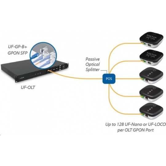 k 1 portu GPON možno pripojiť až 128 jednotiek CPE na vzdialenosť až 20 km. UF-LOCO je kompatibilný s UF-OLT a tiež s niektorými jednotkami OLT od iných výrobcov.