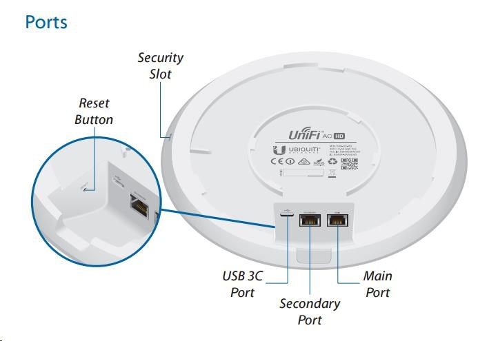 uniFi AP AC HD je prvým zariadením 802.11ac wave2 AP od Ubiquiti s celkovou priepustnosťou až 2533Mbps (2.4GHz 800Mbps + 5GHz 1733Mbps), má 4x4 MU-MIMO všesmerové dvojpásmové polarizácie. 3dBi antény pre 2.4GHz a 4dBi pre 5GHz s rádiovým výkonom do 25dBm pre obe frekvencie 2.4 a 5GHz súčasne. Podporuje 802.11a/b/g/n/ac/ac wave2, má dve gigabitové.ethernet. porty (druhý je v mostíku). Môže byť napájaný prostredníctvom aktívneho PoE podľa 802.3at alebo pasívne (48 V DC), adaptér PoE je súčasťou dodávky (pasívne). Maximálna spotreba energie je 17 W.