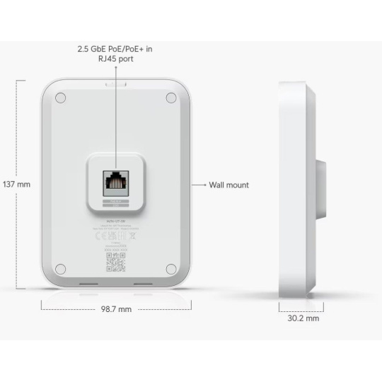 Popis produktu U7-IW je WiFi 7 access point z rodiny UniFi, který je určený k zabudování na krabičku ve zdi. Dual-band WiFi 7 nabízí maximální modulační rychlost až 4,3Gbps v pásmu 5 GHz a až 688Mbps v pásmu 2.4 GHz. Pro připojení k síti má na zadní straně (1) 2.5G ETH port, který slouží i pro napájení jednotky pomocí PoE 802.3af/at či pasivního PoE 42,5 až 57V DC. I po instalaci na krabičku vám zůstanou dostupé (2) 2.5G ETH porty, z nichž jeden podporuje PoE-OUT pro připojení dalšího zařízení. V případě využití PoE-OUT funkce je potřebné jednotku napájet PoE+ 802.3at 30W. Centrální řízení jednotek K zařízení je potřeba stáhnout z oficiálních stránek originální software nazývaný UniFi Network, díky kterému lze řídit celou síť. Nespornou výhodou UniFi Network je, že je zcela zdarma bez jakéhokoliv omezení! Tento centrální management umožní nahrávat mapy a nastavit základní parametry jako například SSID, guest účet, úvodní stránku, statistiky provozu i seznam a status asociovaných klientů vždy snadno a rychle. Výhody UniFi řešení • Roaming - přechod mezi jednotlivými AP bez výpadků • Wireless uplink – ideální pro místa, kam nelze přivést datový kabel • Až 8 SSID • Detailní statistiky provozu • Guest síť • Voucher system • Load balancing - udržování rovnoměné zátěže / přepínání klientů • Omezování rychlosti pro každé SSID Obsah balení • Zařízení • Podložka na přichycení ke zdi • Šroubky Technické parametry Bezdrátové vlastnosti Bezdrátové frekvence:2.4 + 5 GHz (dual band) WiFi standardy:802.11n, 802.11a, 802.11ac, 802.11b/g, 802.11ax, 802.11be MU-MIMO:Ano Přenosová rychlost - 5GHz [Mb/s]:4300 Přenosová rychlost - 2.4GHz [Mb/s]:688 Vysílací výkon 2.4GHz [dBm]:23 Vysílací výkon 5GHz [dBm]:24 Šifrování:WPA, WPA2, WPA3 2.4GHz MIMO:2 x 2 5GHz MIMO:2 x 2 Typ antény:Vestavěná Roaming:Ano Zisk antény [dBi]:4, 8 Konektory a rozhraní Rychlost LAN:(3) 100/1000/2500Mbps Gigabit LAN:Ano Napájení Napájení přes PoE:802.3af, 802.3at, 42 .. 57V DC Typy PoE:PoE-Out + PoE-In Počet PoE Out portů:1 Max. spotřeba energie [W]:13 Fyzické charakteristiky Použití:Vnitřní Tlačítka:Reset Provozní teplota [°C]:-30 až 40 Hmotnost [g]:400 Šířka [mm]:99 Výška [mm]:137 Hloubka [mm]:30 Software Operační mód:Access Point.