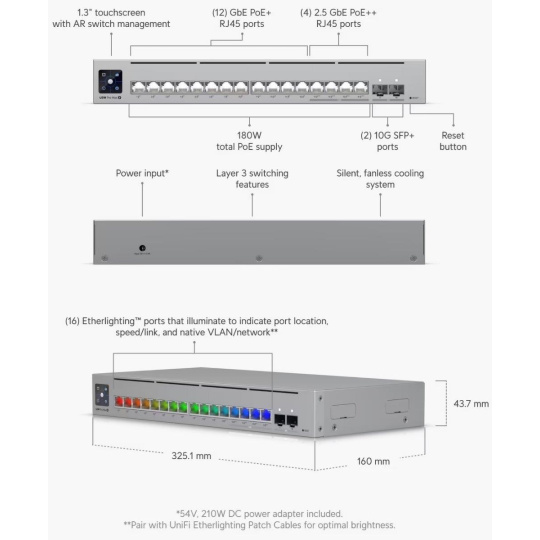 Popis produktu Ubiquiti Pro Max 16-PoE je novým L3 switchem, který nabízí 4x 2.5 Gbps porty s PoE++ až 60W a 12x 1 Gbps porty s PoE+. Celkový PoE budget je 180 W. Pro připojení pomocí optického rozhraní jsou připraveny 2 SFP+ porty dosahující rychlosti až 10 Gb/s. Switch je napájen DC adaptérem 54V DC 210W. Etherlighting technologie Switch podporuje technologii Etherlighting, která umožňuje barevně indikovat lokaci portu, linkovou rychlost, nadefinované typy zařízení, PoE status nebo barevně odlišit jednotlivé VLAN. *pro správnou funkci je doporučeno použít Ubiquiti UniFi Etherlighting Patch kabely Správa přes UniFi Controller Switch nemá webový management, ale je spravován centrálně pomocí UniFi Controlleru s podporou mobilní aplikace UniFi a nabízí rozsáhlou sadu pokročilých přepínacích protokolů a funkcí L2, včetně provozního režimu (přepínání, zrcadlení nebo agregace) na port. UniFi Network Controller a mobilní aplikace umožňují správcům konfigurovat a sledovat prakticky všechny funkce přepínače v grafickém uživatelském rozhraní odkudkoli. Obsah balení • Zařízení • Napájecí DC adaptér • Montážní set Technické parametry Konektory a rozhraní Rychlost LAN:(12) 10/100/1000Mbps + (4) 10/100/2500Mbps Optické rozhraní:(2) 1G/10Gbps Ostatní:Dotykový displej Napájení Typ napájení:DC konektor Typy PoE:PoE-Out (pouze) Podporované PoE-Out standardy:802.3af, 802.3at, 802.3at - ultra PoE (60W) Počet PoE Out portů:16 PoE budget [W]:180 Max. spotřeba energie [W]:210 Napájení přes konektor/svorkovnici:54V DC Fyzické charakteristiky Provedení:Na zeď, Rackmount Ventilátory:Ne Šasi:Kovové Tlačítka:Reset Provozní teplota [°C]:-5 až 40 Šířka [mm]:325 Výška [mm]:44 Hloubka [mm]:160 Obecné Rychlost přepínání [Gbps]:84 Rychlost předávání paketů [Mpps]:62 Software Management:UniFi Network Funkce:VLAN, DHCP snooping, L3 Výchozí IP adresa:Dynamická z DHCP.