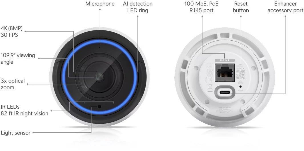 Popis produktu Bullet kamera G5 Professional od Ubiquiti Networks je kamera s 8MP rozlišením (3840 x 2160px při 30 fps), opravdu velkým 1/2" senzorem, varifokálním objektivem 4.1 až 12.3mm, motorickým 3x optickým zoomem, pozorovacím úhlem 35 až 110°, integrovanými vysokovýkonnými infračervenými LED diodami pro noční vidění do vzdálenosti 25m, audio mikrofonem, stupněm krytí IP65 proti vodě a antivandal ochraně IK04. Kamera ke komunikaci směrem do sítě využívá pouze 10/100 Mbps LAN port s podporou napájení přes 802.3af PoE s maximální spotřebou 13W. Nastavitelná základna může být namontována na rovný povrch či sloup. UniFi Protect Software UniFi Protect Controller je výkonná integrovaná IP video monitorovací platforma určená pro práci s kamerami UniFi Protect a mobilní aplikací UniFi Protect. Klíčové vlastnosti • 4K rozlišení - 8MP, 3840 x 2160px při 30 fps • 3x optický zoom • IR přísvit na vzdálenost 25m • Detekce událostí pomocí AI • Integrovaný audio mikrofon • IP65 krytí + antivandal IK04 • Možnost připojení dodatečného příslušenství přes USB-C Obsah balení • Zařízení • Držák na zeď či stožár • Příchytový materiál Technické parametry Kamera WDR:Digitální Typ objektivu:Varifokální - motorický Objektiv [mm]:4,1 až 12,3 (nastavitelný) Přísvit:IR Pozorovací úhel [°]:35 až 110 Režim den/noc:IR cut filtr Obrazový senzor ["]:1/2 Obraz Rozlišení:8MP Max. rozlišení [pixely]:3840 x 2160 (4K UHD) Konektory a rozhraní Audio:Mikrofon Rychlost LAN:(1) 10/100Mbps Napájení Napájení přes PoE:802.3af, 37 .. 57V DC Typ napájení:PoE Max. spotřeba energie [W]:13 Fyzické charakteristiky Stupeň krytí:IP65 Použití:Venkovní Antivandal (ochrana proti nárazu):IK4 Tlačítka:Reset Provozní teplota [°C]:-20 až 50 Hmotnost [g]:650 Šířka [mm]:86 Výška [mm]:86 Hloubka [mm]:154 Barva:Bílá Kompresní standardy Video komprese:H.264 Obecné Kamerová řada:UniFi Protect Software Výchozí IP adresa:192.168.1.20 Výchozí jméno a heslo:ubnt / ubnt.