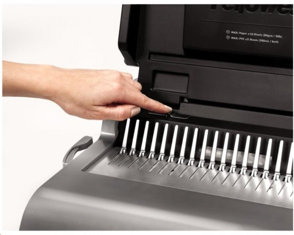 Špičkový dizajn, funkčná presnosť a komfortná obsluha sú vlastnosti tohto vazača s elektrickým pohonom děrovacieho nástroja. Děrovací kapacita až 25 listov 80 g papiera. Kapacita vazby až 500 listov. Je optimálnou voľbou pre pohodlnú prácu pri kancelárskom použití. Vkladanie děrovaných listov shora a presné nastavenie dorazu zväzku významne pomáha zabezpečiť jeho bezchybné perforovanie.