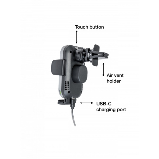Rýchlonabíjací držiak na telefón ponúka jednoduché použitie, bezpečnosť a praktickosť. Vyberte si, či držiak nainštalujete na ventilačný otvor automobilu alebo ho pomocou prísavky prichytíte na palubnú dosku alebo čelné sklo. Keď telefón vložíte do držiaka, postranné ramienka ho automaticky uchopia a postarajú sa o to, že telefón zostane na svojom mieste. Ramienka sa otvárajú stlačením tlačidiel na stranách nabíjačky. Držiak je možné otáčať o 360°, čo zabezpečuje optimálne prezeranie a jednoduché využívanie funkcií.