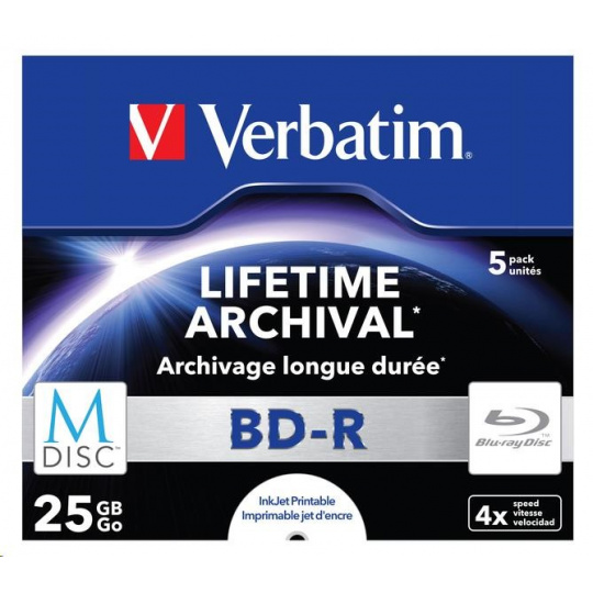 Verbatim M-Disc BD-R Verbatim M-Disc predstavuje nový štandard v oblasti digitálneho ukladania dát, ktorý je navrhnutý na uchovávanie a ochranu súborov vyrytím informácií do patentovanej vrstvy, ktorá je pevná ako skala a odolná voči svetlu, teplote a vlhkosti. Testovanie podľa priemyselnej normy ISO/IEC 10995 spoločnosťou Millenniata ukázalo, že očakávaná životnosť diskov M-Disc DVD je 1 332 rokov, pričom len 5 % diskov vykazuje známky straty údajov po 667 rokoch. Priemerná dĺžka života je preto niekoľko sto rokov. To znamená, že keď ukladáte svoje vzácne fotografie, hudobné knižnice, lekárske dokumenty alebo iné údaje, môžete si byť istí, že sú na disku, ktorý vydrží celé generácie. Vďaka vynikajúcej kompatibilite možno na disk M-Disc BD-R zapisovať a čítať z neho vo všetkých súčasných mechanikách Bluray. Parametre: Kapacita: 25 GB Rýchlosť: 4x Spôsob balenia: balenie po 5 ks (Jewel Case) Povrch disku: potlačiteľný na atramentových tlačiarňach Tlačová plocha: 40 - 118 mm..