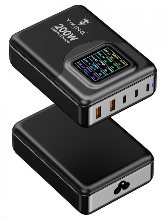 So tromi výstupmi USB-C PD (100W max.) a dvomi USB-A QC (18W max.) je táto nabíjačka pripravená dodať energiu piatim zariadeniam súčasne, a to s maximálnym výkonom až 200W. So Viking USB GaN nabíjačkou 200W PD Pro si môžete byť istí, že vaše elektronické zariadenia budú nabité a pripravené na akciu v rekordnom čase. Inteligentná technológia adaptéra Viking Gan 200W PD Pro dokáže rozdeliť nabíjací výkon podľa počtu využitých výstupov, tak aby bolo nabíjanie jednoduché a efektívne pre všetky pripojené zariadenia. Rozdelenie energie a priebeh nabíjania môžete sledovať na prehľadnom farebnom displeji.