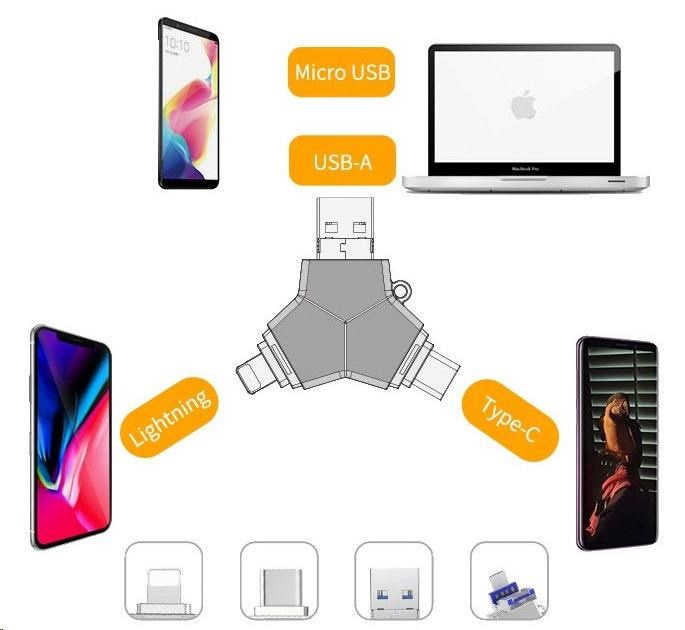 Nový, moderný a mimoriadne ľahký USB FLASH DISK 4v1 s APPLE LIGHTNING / MICRO USB / USB-C / USB 3.0 s internou pamäťou 32 GB, 64 GB, 128 GB. Ideálne na spoľahlivé zálohovanie a prenos údajov z akéhokoľvek zariadenia.