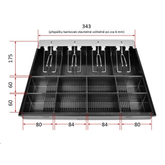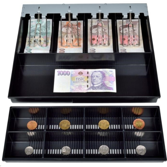 | Prihrádky | 4× na bankovky 8× na mince - vyberateľný mincovník |