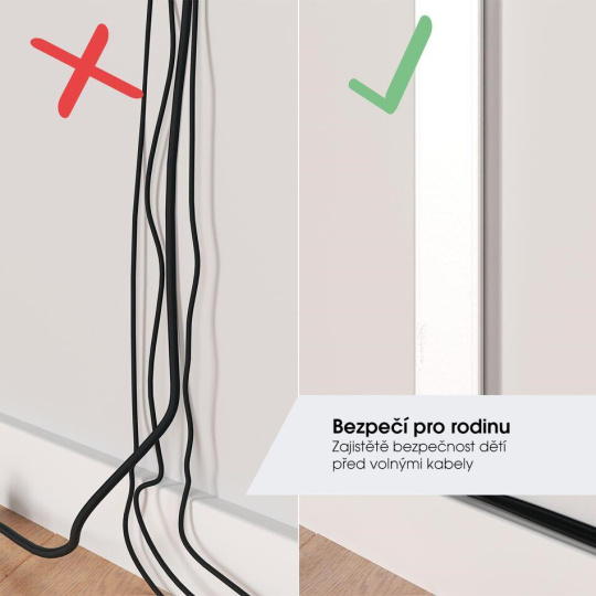S kabelovou lištou TVA 6000 môžete bezpečne a upratané skryť štyri káble mimo dosah detí a domácich zvierat. Dizajn je štýlový a veľmi plochý s minimálnou vzdialenosťou od steny len 14 mm a dĺžkou 80 cm. Je samozrejme vhodný pre ukrytie rôznych typov káblov, napríklad HDMI, USB, AUX alebo napájacích káblov.