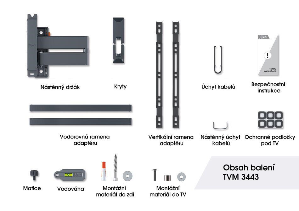 Jedným prstom môžete televízor presunúť do požadovanej polohy. Nástenný držiak TVM 3443 je vybavený funkciou One-Finger™ Movement. Vďaka špeciálnym ložiskám je pohyb nástenného držiaka veľmi plynulý a ľahký. Pre bezpečné naklápnutie a zaistenie televízora je držiak vybavený jedinečným systémom TiltAnchor™, ktorý uzamkne náklon TV vo zvislej polohe.