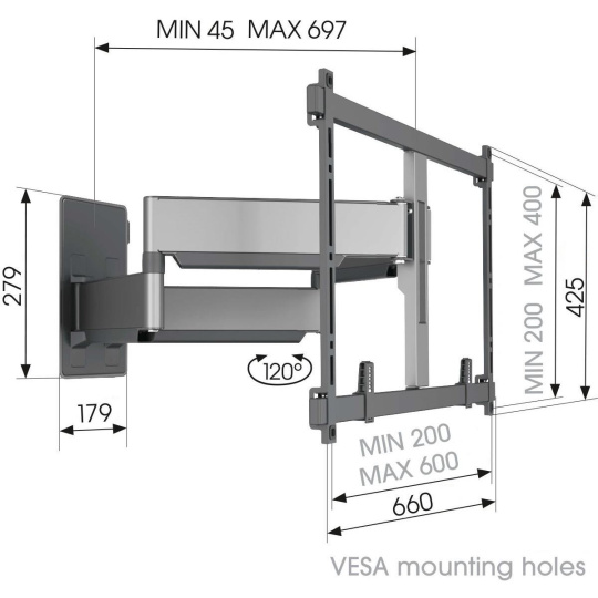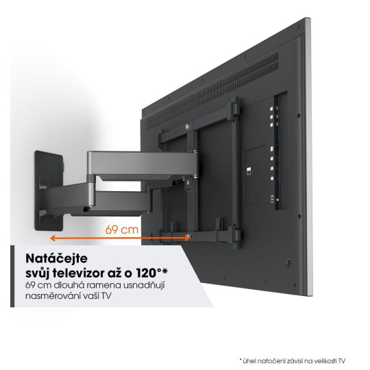 - odtiahnutie TV od steny na 69,7 cm, otáčanie do strán 120° (maximálny uhol otáčania závisí od šírky konkrétneho TV)