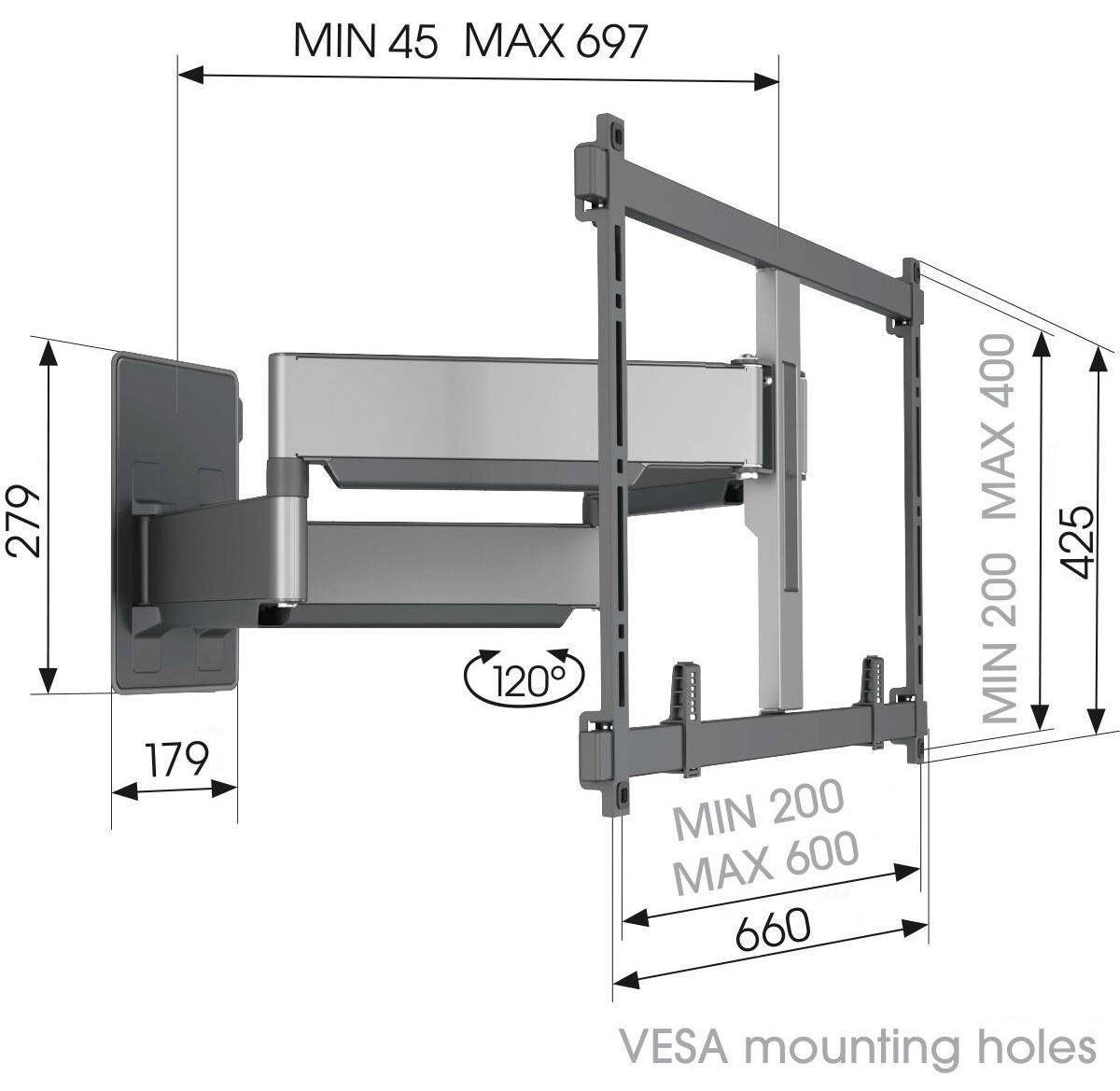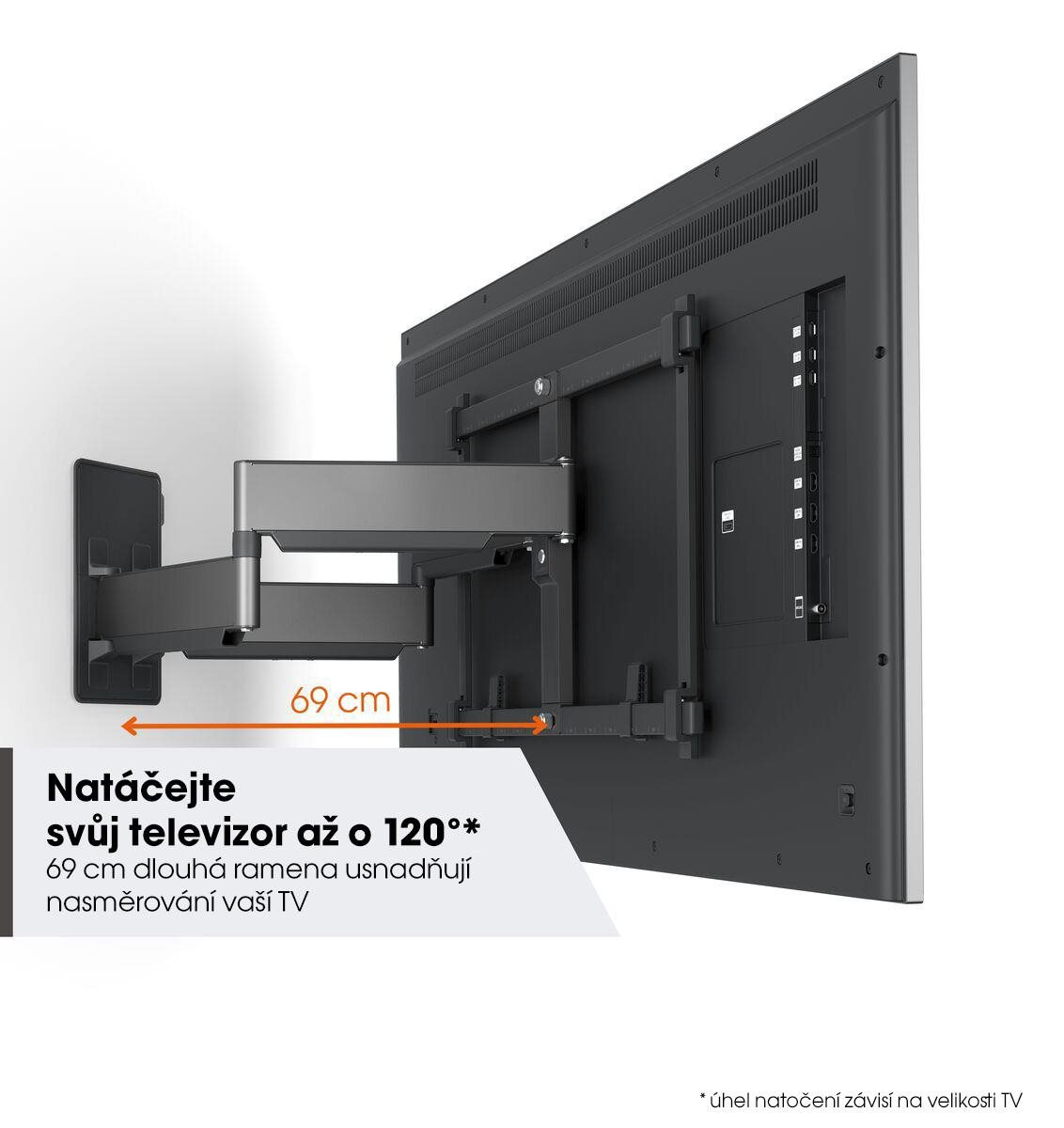 • odtiahnutie TV od steny na 69,7 cm, otáčanie do strán 120° (maximálny uhol otáčania závisí od šírky konkrétneho TV)