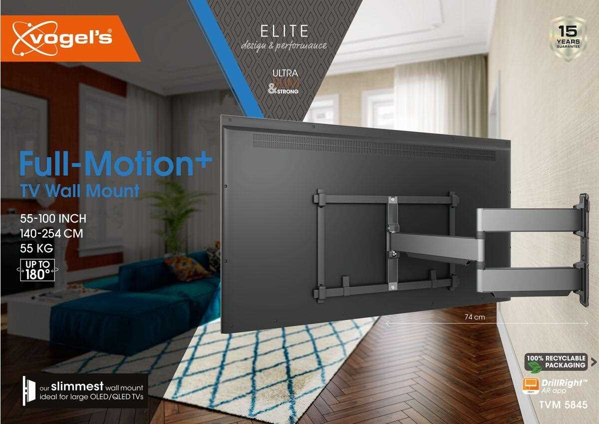 Nástenný držiak ELITE Forward Motion TV je špeciálny, mimoriadne pevný nástenný držiak vhodný pre televízory s uhlopriečkou 55 až 100 palcov a hmotnosťou až 75 kg - ideálny pre veľké OLED alebo QLED televízory. ELITE Forward Motion sa otáča až o 120°, takže môžete televízor sledovať prakticky z akéhokoľvek uhla. Držiak na stenu je nielen veľmi pevný, ale aj veľmi tenký, takže medzi televízorom a stenou ostáva len 4,5 cm.