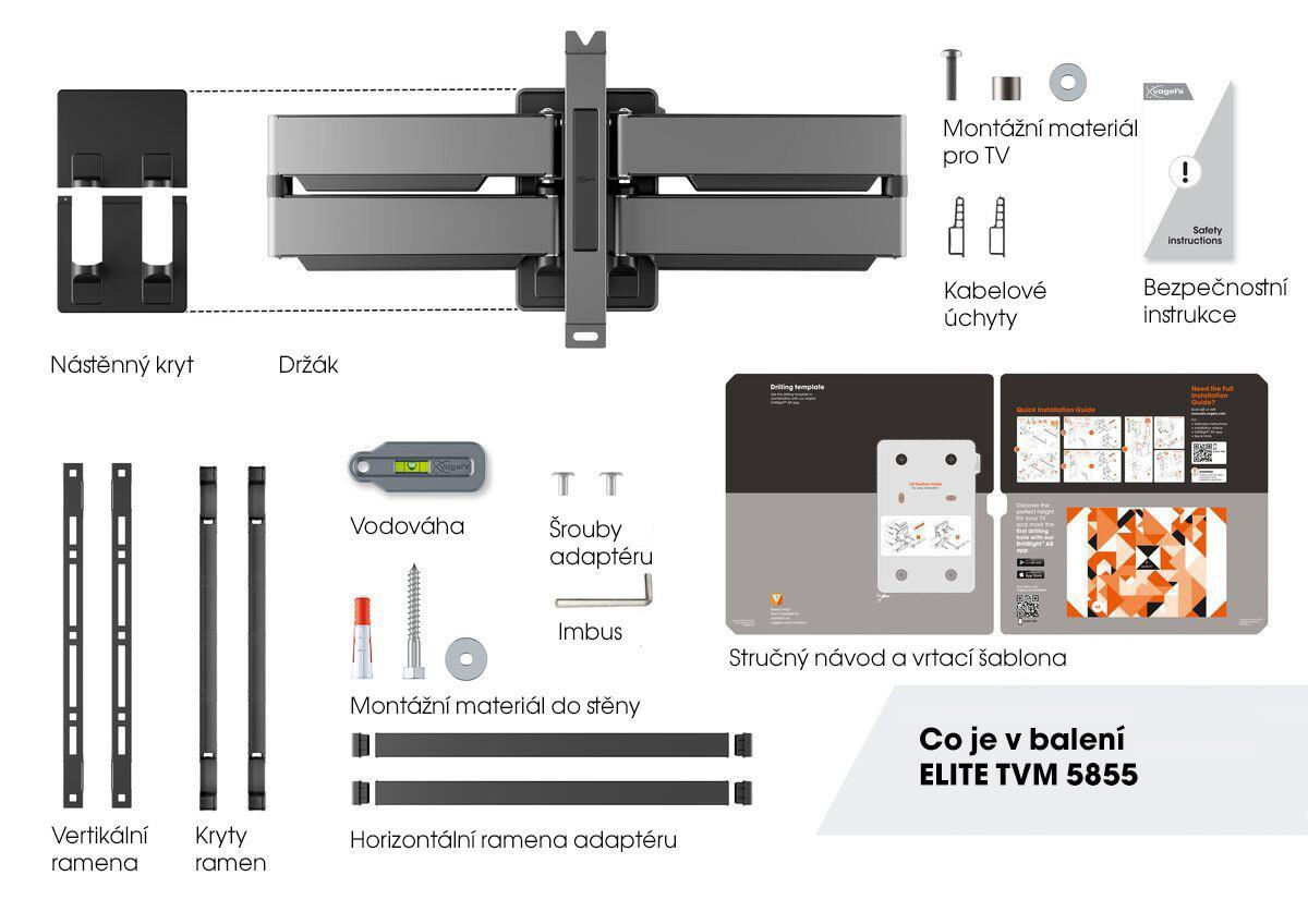 Držiaky rady ELITE sa ľahko inštalujú. Súčasťou balenia je stručný návod na inštaláciu a podrobný manuál a inštalačné video sú dostupné online. Súčasťou dodávky je všetok potrebný inštalačný materiál: vodováha, vrtacia šablóna, extra široká nástenna doska, šrouby a hmoždinky Fischer DuoPower®. A s našou bezplatnou aplikáciou DrillRight™ AR môžete ľahko označiť na stene prvý vrtací otvor. Príjemný detail: mäkké ochranné krytky na nástennej držiaku zabraňujú poškriabaniu zadnej strany televízora pri inštalácii.
