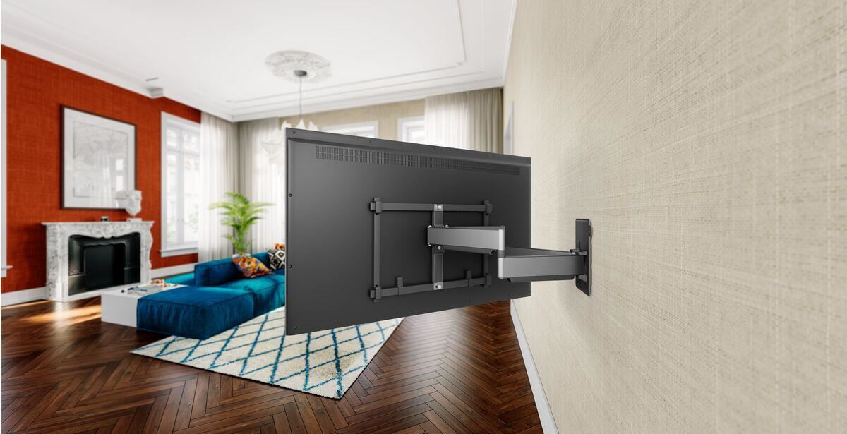 Vďaka 69 cm dlhým ramenám má držiak veľký dosah dopredu, takže je ideálny na montáž do skrine alebo niky. Funkcia naklápania bola zámerne vynechaná kvôli ochrane veľkých citlivých obrazoviek. Výhodou veľkých obrazoviek je samozrejme to, že pre skvelý zážitok zo sledovania nie je nutné nakláňať.
