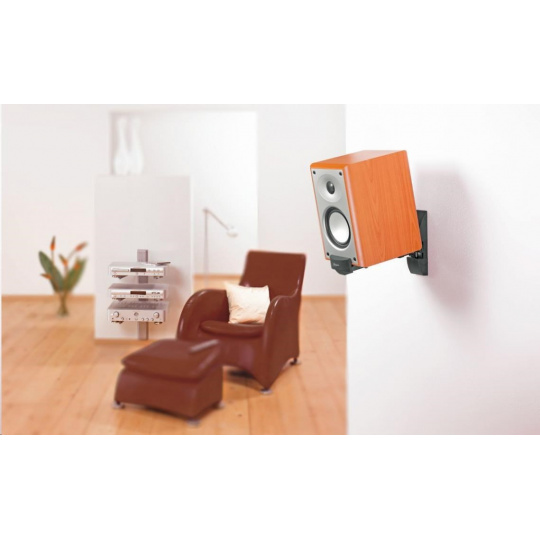 Nástenný držiak bez nutnosti vŕtania do reproduktorovej skrinky, ktorá je upnutá čeľusťovým mechanizmom. Ideálne pre stredne veľké regálové reproduktory