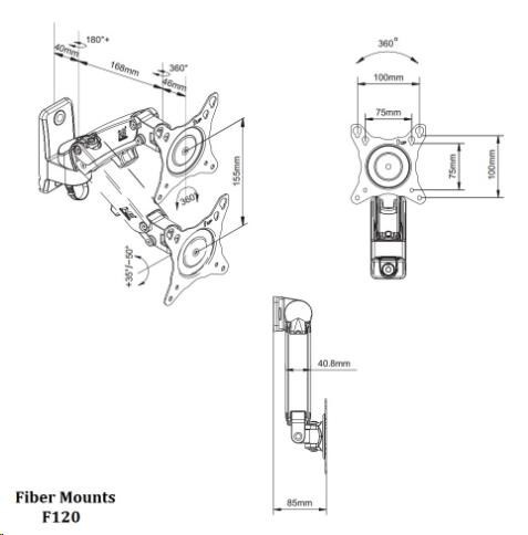 Technické údaje: minimálna hmotnosť obrazovky 2kg maximálna hmotnosť obrazovky 7kg podpora VESA štandardu 75x75 a 100x100 (rozšírenie za príplatok až na 200x200) na obrazovky 15" až 37" otočný do strán +/- 75° sklon +35° / -50° minimálna vzdialenosť od steny 85mm maximálna vzdialenosť od steny 283mm výškové nastavenie obrazovky 155mm horizontálne aj vertikálne otočenie obrazovky systém vedenia káblov veľmi jednoduché polohovanie obrazovky nastavenie tuhosti chodu TOP kvalita nádherný dizajn v čiernom alebo chromovom prevedení záruka 5 rokov Držiak podporuje VESA štandardy: VESA 75x75 VESA 100x100 VESA 200x100 - za príplatok VESA 200x200 - za príplatok