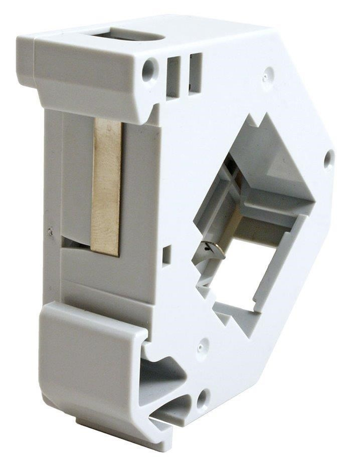 Plastový držiak na 1 lichobežníkový kameň na DIN lištu. Integrovaný kovový pásik zaisťuje uzemnenie lichobežníkového modulu.Štítok pre popis (odnímateľný po odstránení bočného krytu)..