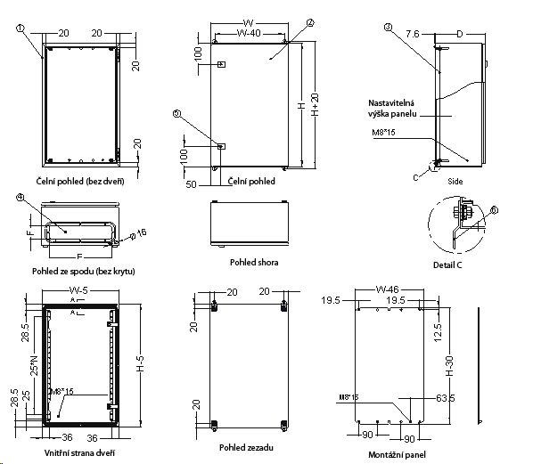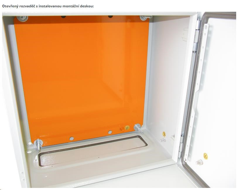 Rozvádzač je vyrobený z valcovej ocele hrúbky 1,5 mm. Normy: IEC60529, EN60529/10.91, GB4208-93 Detaily konštrukcie: dvere - plné, otvárajúce sa o 110 stupňov, montáž pravá alebo ľavá (používateľsky vymeniteľné otváranie) zadný kryt - plný bočný kryt - plný horný kryt - plný montážna doska: