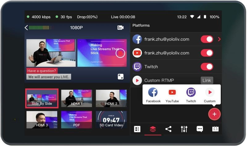 Najrozšírenejšie streamovacie platformy, ako Facebook Live, YouTube a Twitch, sú priamo integrované do zariadenia. Stačí, ak sa jednoducho prihlásite k svojmu účtu na sociálnej sieti a môžete streamovať.
